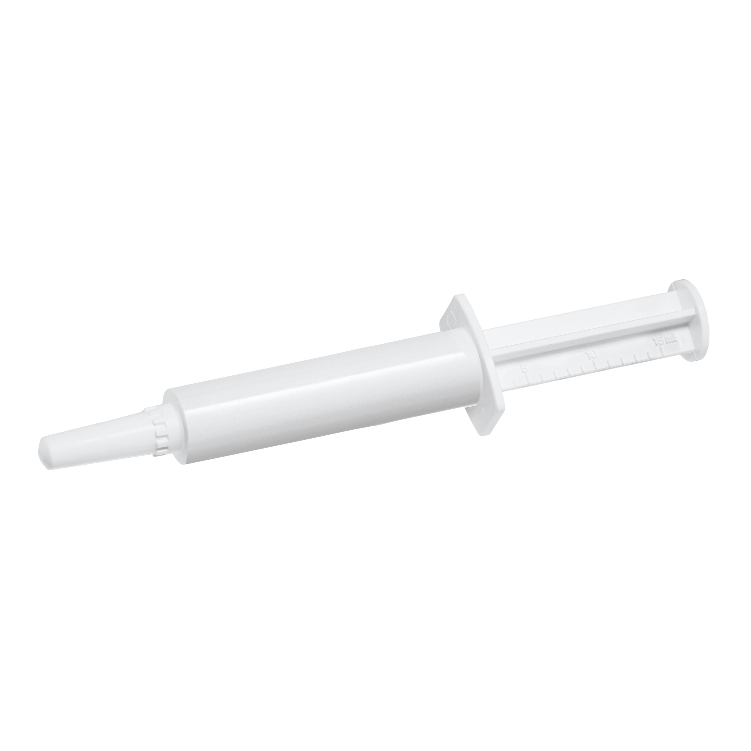Do dozowania past doustnie. Średnica końcówki wprowadzającej 4,5 mm. Materiał: PE o niskiej gęstości, nietoksyczny, gwarantujący dobrą szczelność. Zamknięcie z blokadą.
